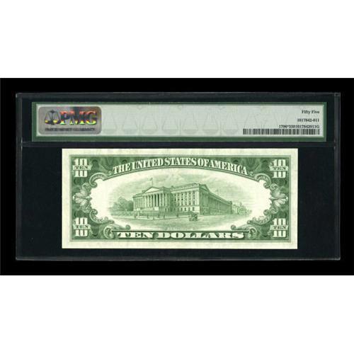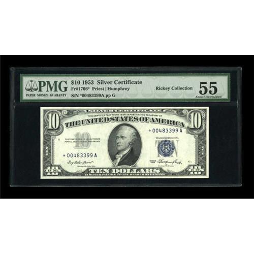 <B>Fr. 1706* $10 1953 Silver Certificate. PMG About Uncirculated 55.</B></I><BR> A very lightly circulated example of this challenging later blue seal star that is very well margined with crackling fresh paper.<BR><BR><b>Shipping:</b> Coins & Currency (<a target="_blank" href="http://www.heritageauctions.com/common/shipping.php">view shipping information</a>)