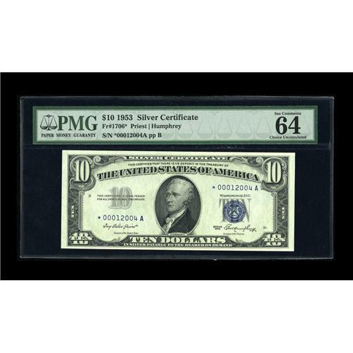 <B>Fr. 1706* $10 1953 Silver Certificate. PMG Choice Uncirculated 64 EPQ.</B></I><BR>A paltry number of survivors are known from an original printing of 576,000. This piece is Gem quality save for a tight lower margin.<BR><BR><b>Shipping:</b> Coin/Currency (<a target="_blank" href="http://www.heritageauctions.com/common/shipping.php">view shipping information</a>)