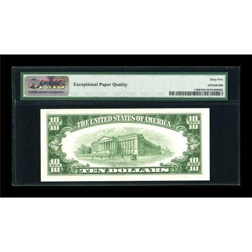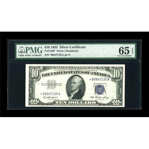 <B>Fr. 1706* $10 1953 Silver Certificate. PMG Gem Uncirculated 65 EPQ.</B></I><BR> Plenty of embossing is seen on this ever popular and difficult replacement. The margins are quite pleasing and certainly could have been near superb with a hair more bottom margin.<BR><BR><b>Shipping:</b> Coins & Currency (<a target="_blank" href="http://www.heritageauctions.com/common/shipping.php">view shipping information</a>)