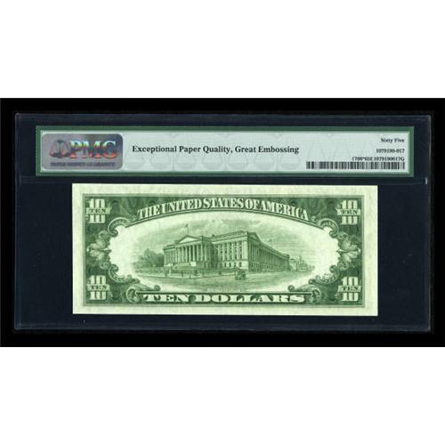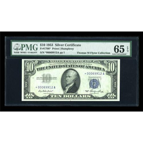<B>Fr. 1706* $10 1953 Silver Certificate. PMG Gem Uncirculated 65 EPQ.</B></I><BR> A lovely example of this sought after star, which not only garnered the EPQ rating but the "Great Embossing" designation as well. <BR><I>From The Thomas M. Flynn Collection</B></I><BR><BR><b>Shipping:</b> Coins & Currency (<a target="_blank" href="http://www.heritageauctions.com/common/shipping.php">view shipping information</a>)