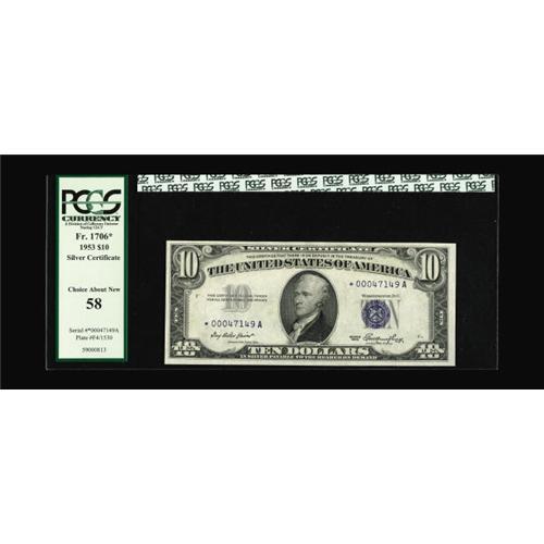 <B>Fr. 1706* $10 1953 Star Silver Certificate. PCGS Choice About New 58.</B></I><BR>This replacement note has nice margins with embossing seen through the holder.