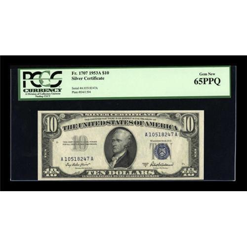 <B>Fr. 1707 $10 1953A Silver Certificate. PCGS Gem New 65PPQ.</B></I><BR> A well margined and nicely centered note which will please the most discriminating buyer.<BR><I>From The Drew Keough Collection</B></I><BR><BR><b>Shipping:</b> Coins & Currency (<a target="_blank" href="http://www.heritageauctions.com/common/shipping.php">view shipping information</a>)