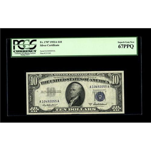 <B>Fr. 1707 $10 1953A Silver Certificate. PCGS Superb Gem New 67PPQ.</B></I><BR>The 1953A Series has been proven to be a much tougher series over the years. This example displays embossing and is also wonderfully centered. To date the highest graded example of this series we have seen.<BR><I>From The Bill and Kathy Stella Currency Collection</B></I><BR><BR><b>Shipping:</b> Coin/Currency (<a target="_blank" href="http://www.heritageauctions.com/common/shipping.php">view shipping information</a>)