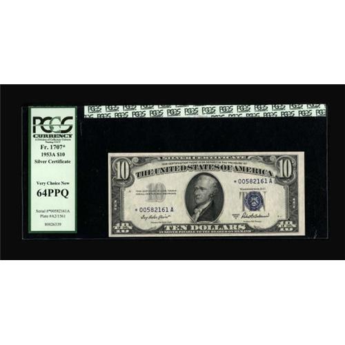 <B>Fr. 1707* $10 1953A Silver Certificate. PCGS Very Choice New 64PPQ.</B></I><BR> A thinner margin at left precludes a higher grade on this otherwise colorful, original Blue Seal replacement note.<BR><BR><b>Shipping:</b> Coins & Currency (<a target="_blank" href="http://www.heritageauctions.com/common/shipping.php">view shipping information</a>)