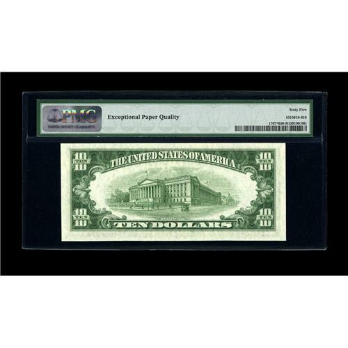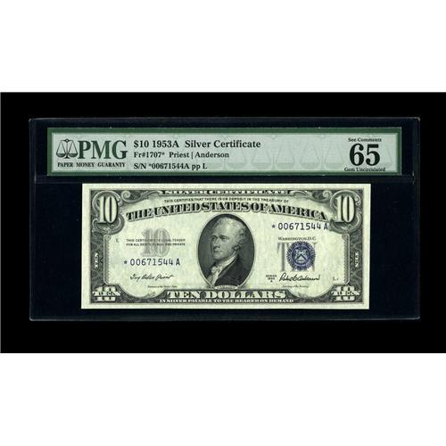 <B>Fr. 1707* $10 1953A Silver Certificate. PMG Gem Uncirculated 65 EPQ.</B></I><BR>This is easily one of the nicest examples of this scarce later star that we have seen in recent years. There are four behemoth margins from the face with picture perfect centering and superb paper quality. The back centering can be the only plausible explanation as to why this is not a Superb Gem CU note.<BR><BR><b>Shipping:</b> Coin/Currency (<a target="_blank" href="http://www.heritageauctions.com/common/shipping.php">view shipping information</a>)
