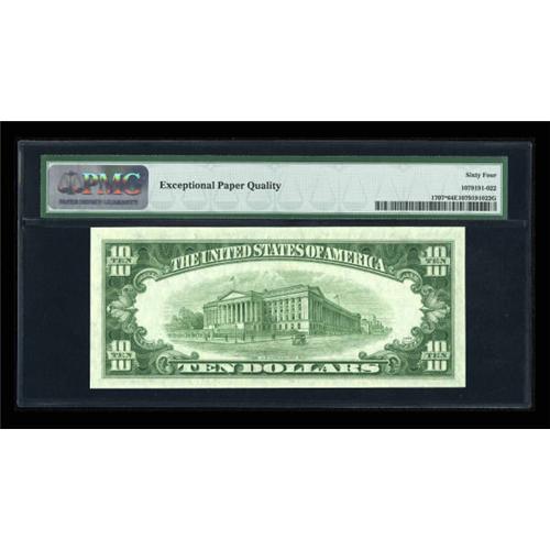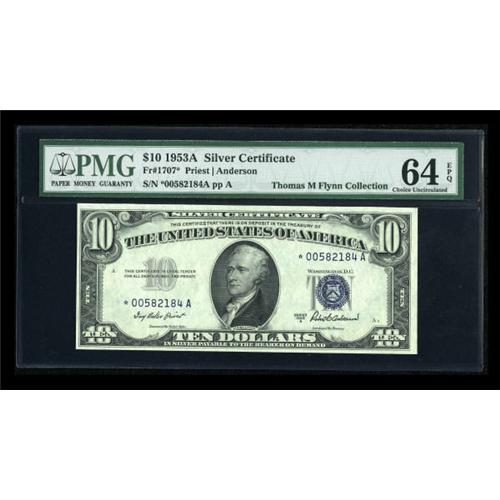 <B>Fr. 1707* $10 1953A Silver Certificate. PMG Choice Uncirculated 64 EPQ.</B></I><BR> The last of the $10 stars. With a hair more left margin this would be a flaming gem. <BR><I>From The Thomas M. Flynn Collection</B></I><BR><BR><b>Shipping:</b> Coins & Currency (<a target="_blank" href="http://www.heritageauctions.com/common/shipping.php">view shipping information</a>)