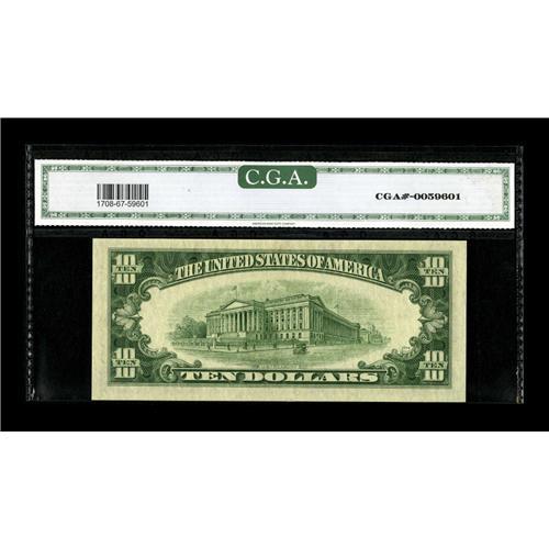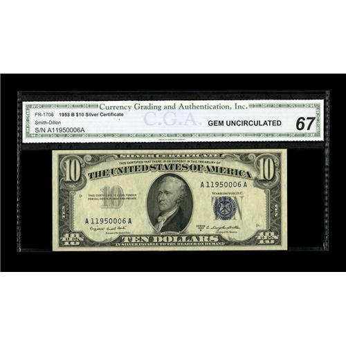 <B>Fr. 1708 $10 1953B Silver Certificate. CGA Gem Uncirculated 67.</B></I><BR>This is not a particularly scarce issue but to find examples in the highest grade ranges is a formidable task.<BR><BR><b>Shipping:</b> Coin/Currency (<a target="_blank" href="http://www.heritageauctions.com/common/shipping.php">view shipping information</a>)