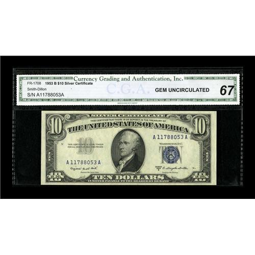 <B>Fr. 1708 $10 1953B Silver Certificate. CGA Gem Uncirculated 67.</B></I><BR>Another very well embossed example from this final series that has vibrant ink colors and superb print quality.<BR><BR><b>Shipping:</b> Coin/Currency (<a target="_blank" href="http://www.heritageauctions.com/common/shipping.php">view shipping information</a>)