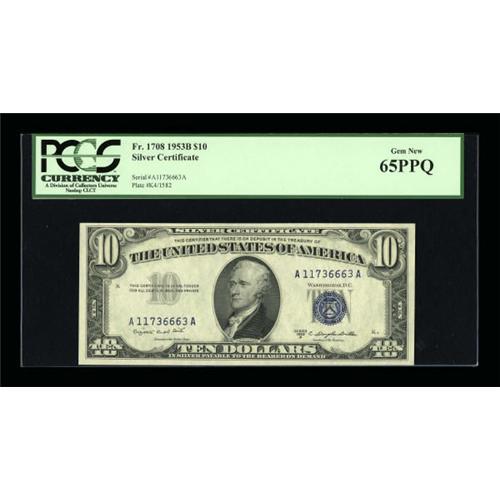 <B>Fr. 1708 $10 1953B Silver Certificate. PCGS Gem New 65PPQ.</B></I><BR> A virtually flawless example with bright ink colors and paper that is crisp and crackling fresh. The punch through embossing and even margins are a nice touch as well.<BR><I>From The Thomas A. Bergin Collection</B></I><BR><BR><b>Shipping:</b> Coins & Currency (<a target="_blank" href="http://www.heritageauctions.com/common/shipping.php">view shipping information</a>)