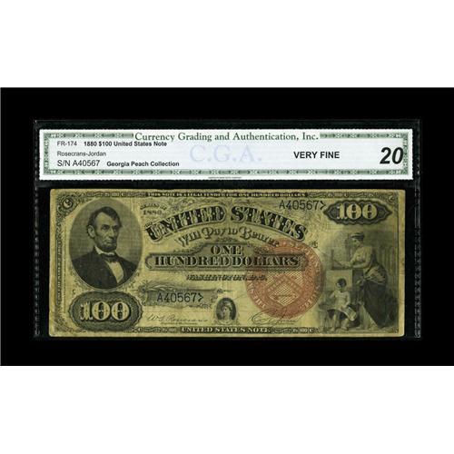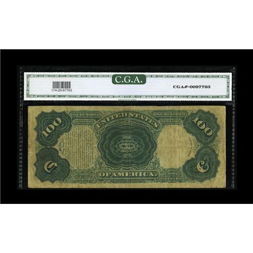 <B>Fr. 174 $100 1880 Legal Tender CGA Very Fine 20.</B></I> Additions of this type to the census are far and few between and with this piece, the total for this Friedberg number sits at a paltry 17 notes. It must be noted though that 6 of the recorded issues are permanently impounded in institutional collections. This particular piece saw a moderate amount of time in channels of commerce before it was placed with other papers, as the toned paper here suggests. Apart from some soft and furled edges, the paper is wholly intact and the printing adequately bright. Along with the Fr. 172, 177, and 180 in this sale, the number of 1880 $100 Legal Tender rarities in one place is an anomaly.