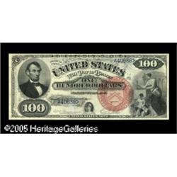<B>Fr. 174 $100 1880 Legal Tender Extremely Fine.</B></I> Sold by us in September 1999 where it was described: "This newly discovered piece brings the total number of examples up to sixteen, six of which are permanently impounded in museums or government hands. This note is tied with three others for second finest known. It is very well margined with strong color and no problems or restorations of any kind." At that sale, the note realized $17,600 and subsequently reauctioned at the height of the market for $29,200. It should realize somewhere between those two figures this evening. Lot:16739