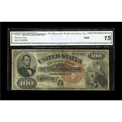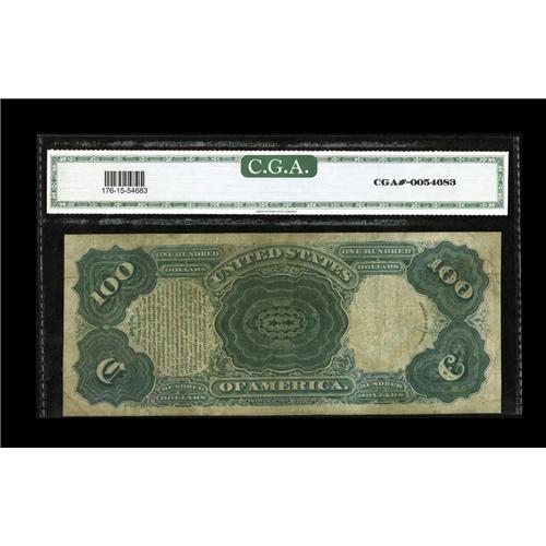 <B>Fr. 176 $100 1880 Legal Tender CGA Fine 15.</B></I> A very rare number with only about a dozen pieces known, none of which is uncirculated. Three of the known pieces are AU, two of which have sold in the last five years for $34,000 and $40,000. This Fine example is a very solid-looking note, with a few minor repairs, the principle one being a small replaced piece in the bottom margin that affects very little of the design. The repairs are well done, and the note gives the appearance of a well margined, nicely colored, solid Fine.<BR><I>From The Ross Bailey Collection</B></I>