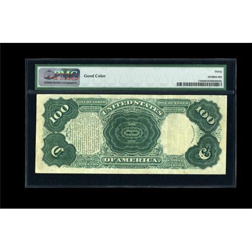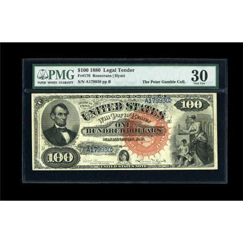 <B>Fr. 176 $100 1880 Legal Tender PMG Very Fine 30.</B></I> PMG has placed the comment "Good Color" on the back of their holder, and they certainly have that right since the bright orange seal and blue serial numbers are both at their full original brilliance--something that is seldom seen at the VF 30 level. This note places fourth out of a census of eleven pieces. The best of them, a PCGS 58, realized over $60,000 in 2005. Interestingly, that finest-known PCGS 58 is consecutive to this note. 1880 $100 Legals have always been one of this cataloger's favorite types, and of that elite group of notes, this large orange seal blue serial number combination has the most striking visual appeal. A problem-free beauty that belongs in the very finest Type Note collections.<BR><I>From The Peter Gamble Collection.</B></I><BR><BR><b>Shipping:</b> Coins & Currency (<a target="_blank" href="http://www.heritageauctions.com/common/shipping.php">view shipping information</a>)