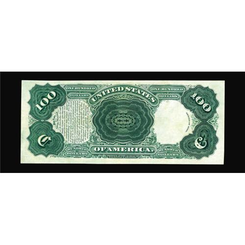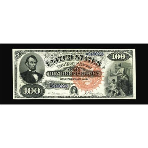 <B>Fr. 177 $100 1880 Legal Tender Extremely Fine-About New.</B></I> Off the market for the last twenty years, this beautiful large seal 1880 hundred has finally reappeared. There are no uncirculated examples known, and only this and two others are in the running for finest known. Of the 21 pieces recorded, three are permanently off the market in government hands. This one is striking in its eye appeal, the large salmon colored seal making a great visual contrast to the bright blue serial numbers. The note also boasts broad margins as well as sharp print quality. Large seal hundred legals are infrequent visitors to the auction block, and the opportunity presented by this bright, fresh note should not be lightly passed up.