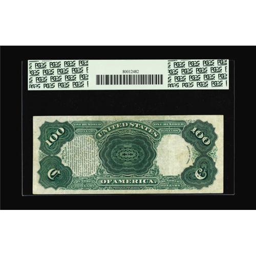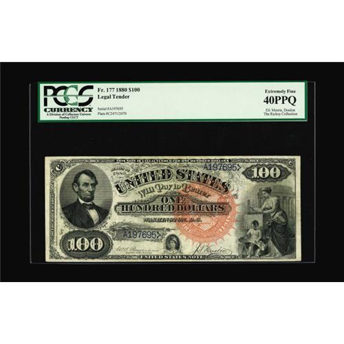 <B>Fr. 177 $100 1880 Legal Tender PCGS Extremely Fine 40PPQ.</B></I> Of only seventeen collectible examples of this issue, only two are available in an About New state of preservation, though one of them has been off the market for over two decades. To date, no uncirculated specimens have been reported. Last May we handled one of the two About New issues as part of the Jim O'Neal Collection. After considerable bidding, that piece realized $69,000. While this note has a couple folds too many to be called About New, the colors, originality, and pedigree are certainly sufficient to receive as much attention as the O'Neal piece.<BR><I>Ex: Morris; Donlon; The Rickey Collection</B></I><BR><I>From The Jeffrey L. Olyan Collection, Part 1</B></I>