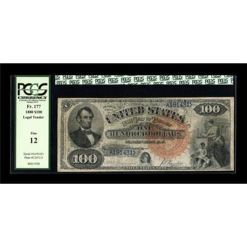 <B>Fr. 177 $100 1880 Legal Tender PCGS Fine 12.</B></I> This piece has been off the market for about 15 years. It is one of only about a dozen and a half examples of this number known to exist. Only one or two pieces are high grade, and this one, while well circulated, appears totally solid and problem free.<BR><BR><b>Shipping:</b> Coins & Currency (<a target="_blank" href="http://www.heritageauctions.com/common/shipping.php">view shipping information</a>)