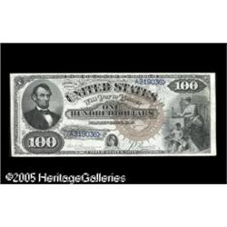<B>Fr. 178 $100 1880 Legal Tender Extremely Fine.</B></I> About fifteen examples of this rare number are known. This one is tied for fourth in the condition census, but two of those four are permanently impounded: one in the ANA museum and the other in government hands. When we first sold this note in May of 1999, it was a fresh-to-the-market piece. It has extremely broad margins all the way around, with no signs of repairs or restorations of any kind and exceptionally nice, bright original colors. From the face, this beautiful rarity appears to be a Gem, but when the back is examined closely, a few folds can be discerned. In May of 1999, it realized $16,500, a figure that we're quite sure it will surpass this evening. Lot:16740
