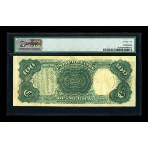 <B>Fr. 178 $100 1880 Legal Tender PMG Very Fine 25.</B></I> Of the fourteen examples known, this is the fourth finest according to the records in Track & Price. No Uncirculated notes are known, and only a single AU, which realized $48,000 in auction in 2005. As with so many of the notes from John Ameen's collection, this piece is not listed in the census which has now increased to 15. The note certainly seemed to have earned its 25 grade. It is an attractive VF by anyone's standard with excellent margins, strong ink color, and lots of eye appeal. <BR><I>From The John Ameen Collection</B></I><BR><BR><b>Shipping:</b> Coins & Currency (<a target="_blank" href="http://www.heritageauctions.com/common/shipping.php">view shipping information</a>)