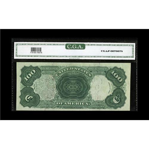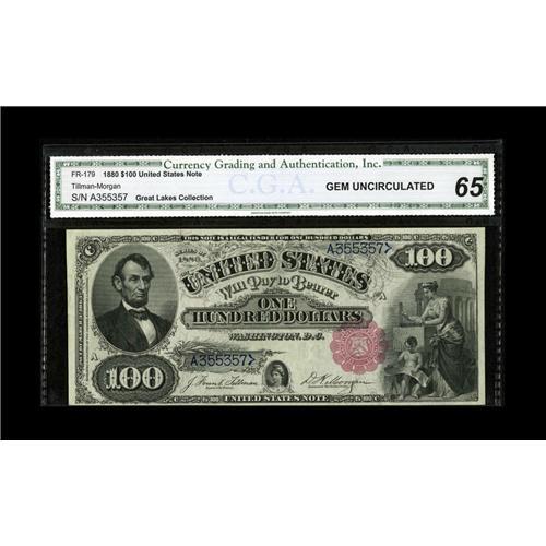 <B>Fr. 179 $100 1880 Legal Tender CGA Gem Uncirculated 65.</B></I> This piece which came to us from the Great Lakes Collection by way of the Grinnell sale has been awarded the grade of Gem Uncirculated. Exceptional colors are seen on this note which is one of fewer than 30 examples known for this type. The majority of which are well worn.