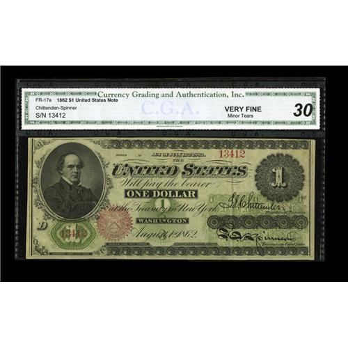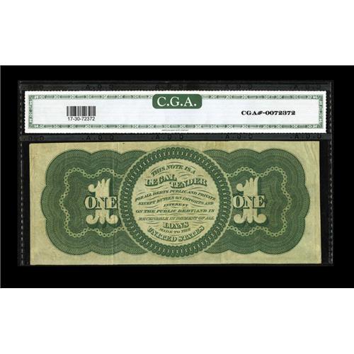 <B>Fr. 17a $1 1862 Legal Tender CGA Very Fine 30.</B></I> A good-looking example, but with the CGA comment on the holder, "Minor tears."