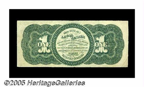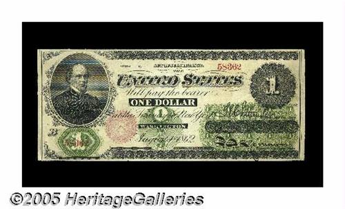 <B>Fr. 17a $1 1862 Legal Tender New.</B></I> The embossing on this example is truly exceptional, especially on the red treasury seal. A few pinholes are noted at lower center and there are a number of corner folds at lower left, keeping this freshly original note from the Choice grade. This number is only occassionally encountered this nice.