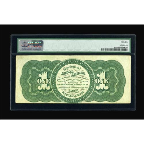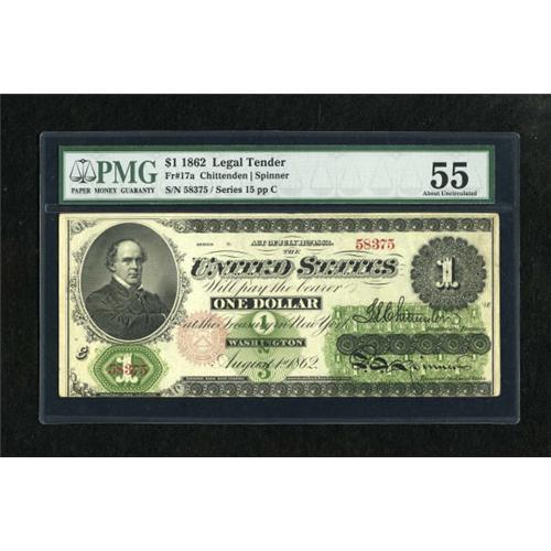 <B>Fr. 17a $1 1862 Legal Tender PMG About Uncirculated 55.</B></I> A couple of corner folds and a somewhat faded seal most likely contributed to the assigned grade. Bright and fresh otherwise, exhibiting a bit of a miscut.<B><BR></B></I><I>From The Warren Marshall Collection</B></I><BR><BR><b>Shipping:</b> Coins & Currency (<a target="_blank" href="http://www.heritageauctions.com/common/shipping.php">view shipping information</a>)