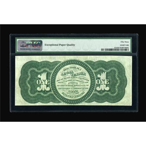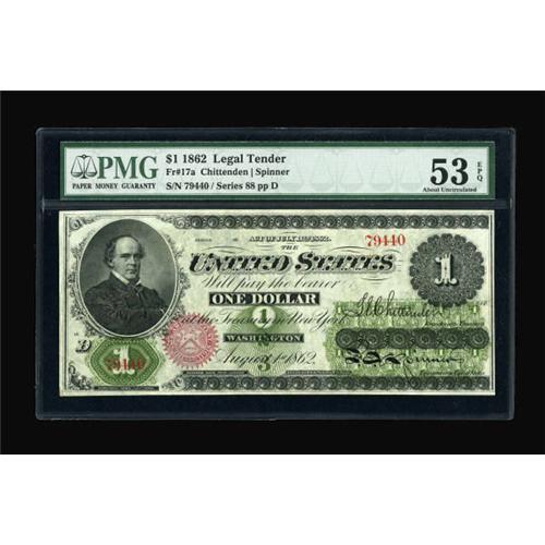 <B>Fr. 17a $1 1862 Legal Tender PMG About Uncirculated 53 EPQ.</B></I> A colorful, lovely ace that has suffered from a couple corner folds. <BR><BR><b>Shipping:</b> Coins & Currency (<a target="_blank" href="http://www.heritageauctions.com/common/shipping.php">view shipping information</a>)