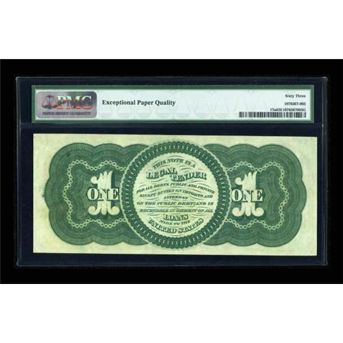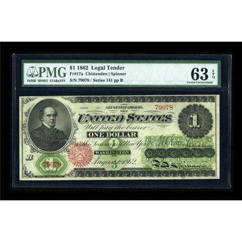 <B>Fr. 17a $1 1862 Legal Tender PMG Choice Uncirculated 63 EPQ.</B></I> This Friedberg number is emerging as a hidden rarity in any grade above AU. PMG has graded only one quarter as many Fr. 17a's as Fr. 16's, with almost all being low to mid grade circulated pieces. To date only this one note has been been awarded the Choice Uncirculated 63 EPQ designation, with only two examples graded higher. This piece is bright, fully original, and would be Gem save for its somewhat tight top margin. If rarity is any guide, this note may certainly surprise this evening. <BR><BR><b>Shipping:</b> Coins & Currency (<a target="_blank" href="http://www.heritageauctions.com/common/shipping.php">view shipping information</a>)