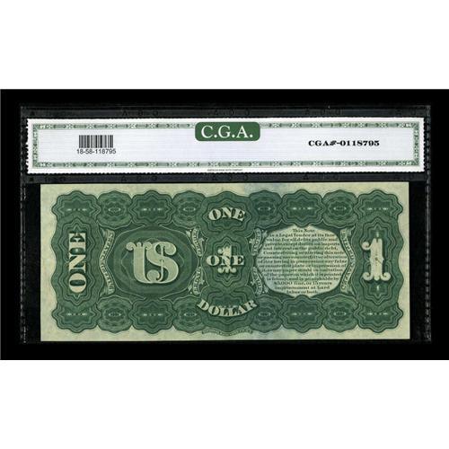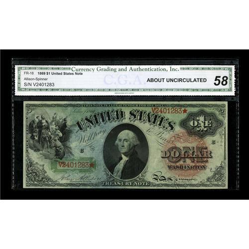 <B>Fr. 18 $1 1869 Legal Tender CGA About Uncirculated 58.</B></I> Bold color and good centering highlight this Rainbow Ace.<BR><BR><b>Shipping:</b> Coins & Currency (<a target="_blank" href="http://www.heritageauctions.com/common/shipping.php">view shipping information</a>)