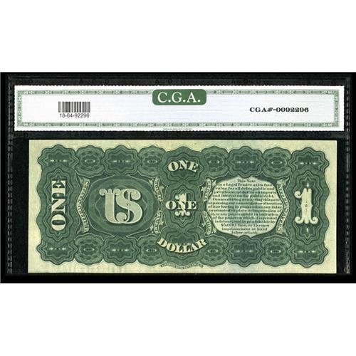 <B>Fr. 18 $1 1869 Legal Tender CGA Choice Uncirculated 64.</B></I> The textured paper on this broadly margined and colorful note shows clearly through the holder. We suspect a hint of handling on the lower margin accounts for the grade.
