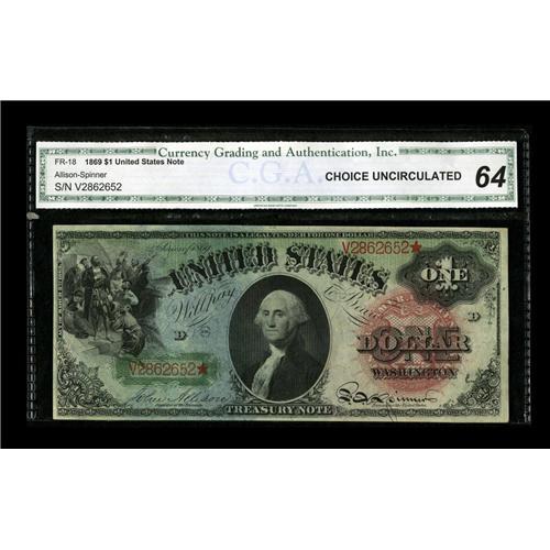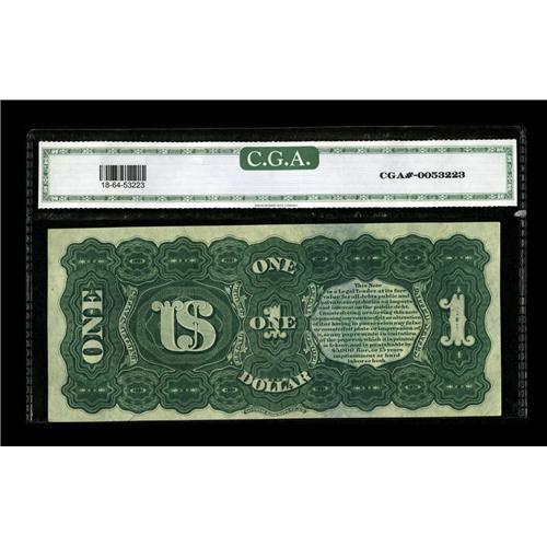 <B>Fr. 18 $1 1869 Legal Tender CGA Choice Uncirculated 64.</B></I> Loads of color and no problems at all that are visible through the third party holder. The 64 grade is very likely the result of the somewhat tight left face margin, as everything else about this piece appears to be pure Gem.<BR><BR><b>Shipping:</b> Coin/Currency (<a target="_blank" href="http://www.heritageauctions.com/common/shipping.php">view shipping information</a>)