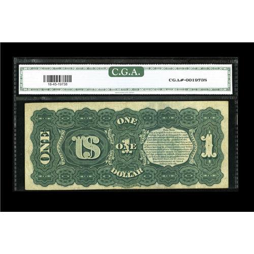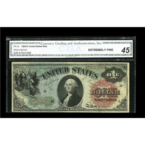 <B>Fr. 18 $1 1869 Legal Tender CGA Extremely Fine 45.</B></I> The colors and face margins are quite pleasing on this Rainbow Ace.