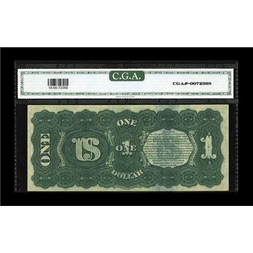 <B>Fr. 18 $1 1869 Legal Tender CGA Gem Uncirculated 66.</B></I> The colors are simply spectacular on this Rainbow Ace. The note is nicely centered on both sides, and the impact of its eye appeal cannot be overstated. Very few 1869 Rainbow notes of any denomination have retained as much flashy color as this piece.