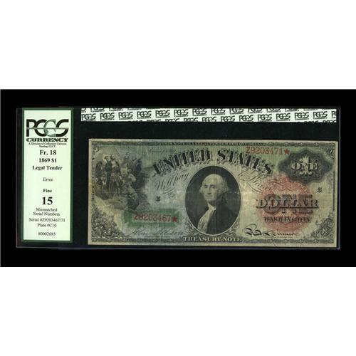 <B>Fr. 18 $1 1869 Legal Tender Mismatched Serial Numbers PCGS Fine 15.</B></I> An incredible new discovery bringing the total of large size notes with mismatched serial numbers to just eleven pieces, with this being the only known example of any Rainbow Series note in that group. This is a two digit mismatch, with the serial on the left reading Z9203467 and the serial on the right reading Z9203471. It is one of only four large size notes known of any kind with two or more digits mismatched. This specimen was recently discovered in the possession of an upstate New York collector, who has had it in his collection for over three decades, but never sought to publicize his long ago discovery. While price comparisons are obviously inexact for a note of this rarity, the only large size National with a mismatched serial number realized well over $30,000 when auctioned several years ago. In a stronger and more sophisticated market for truly rare items, expect this attractive and unique Rainbow Ace to likely surpass that record.