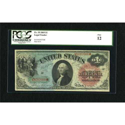 <B>Fr. 18 $1 1869 Legal Tender PCGS Fine 12.</B></I> A most pleasing example for the grade boasting VF or better eye appeal. The colors remain vivid and the margins are ample. A couple of pinholes are noted, but are hardly a distraction.<BR><I>From The Kansas City Collection</B></I><BR><BR><b>Shipping:</b> Coins & Currency (<a target="_blank" href="http://www.heritageauctions.com/common/shipping.php">view shipping information</a>)