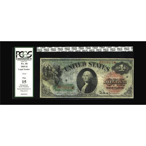 <B>Fr. 18 $1 1869 Legal Tender PCGS Fine 15.</B></I> We last sold this note in our September 2007 Long Beach sale, where it was described, "An incredible new discovery bringing the total of Large Size notes with mismatched serial numbers to just eleven pieces, with this being the only known example of any Rainbow Series note in that group. This is a two-digit mismatch, with the serial on the left reading Z9203467 and the serial on the right reading Z9203471. It is one of only four Large Size notes known of any kind with two or more digits mismatched. This note was recently discovered in the possession of an upstate New York collector, who has had it in his collection for over three decades, but never sought to publicize his long-ago discovery. While price comparisons are obviously inexact for a note of this rarity, the only large-size National with a mismatched serial number realized well over $30,000 when auctioned several years ago. In a stronger and more sophisticated market for truly rare items, expect this attractive and unique Rainbow Ace to likely surpass that record."<BR><BR><b>Shipping:</b> Coins & Currency (<a target="_blank" href="http://www.heritageauctions.com/common/shipping.php">view shipping information</a>)