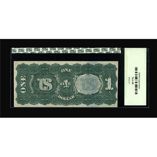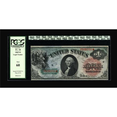 <B>Fr. 18 $1 1869 Legal Tender PCGS New 60.</B></I> The colors are strong on this Rainbow Ace, but the note has been poorly trimmed with the right-face margin right against the design, and the left-face margin cutting into the design.<BR><BR><b>Shipping:</b> Coins & Currency (<a target="_blank" href="http://www.heritageauctions.com/common/shipping.php">view shipping information</a>)