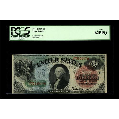 <B>Fr. 18 $1 1869 Legal Tender PCGS New 62PPQ.</B></I> There is little doubt that the close top and bottom margins are responsible for the low-end Uncirculated grade. The colors, clarity, and paper surfaces all belong to a far higher grade piece.<BR><I>From The Bill and Kathy Stella Currency Collection</B></I><BR><BR><b>Shipping:</b> Coin/Currency (<a target="_blank" href="http://www.heritageauctions.com/common/shipping.php">view shipping information</a>)
