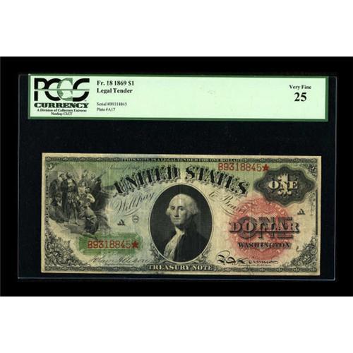 <B>Fr. 18 $1 1869 Legal Tender PCGS Very Fine 25.</B></I> The paper is free of problems and retains much of its original color.<BR><BR><b>Shipping:</b> Coins & Currency (<a target="_blank" href="http://www.heritageauctions.com/common/shipping.php">view shipping information</a>)