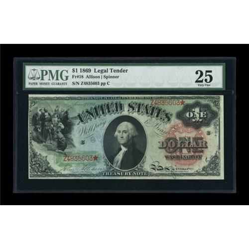 <B>Fr. 18 $1 1869 Legal Tender PMG Very Fine 25.</B></I> This Rainbow certainly has the appearance and eye appeal of a higher grade note.<BR><BR><b>Shipping:</b> Coins & Currency (<a target="_blank" href="http://www.heritageauctions.com/common/shipping.php">view shipping information</a>)