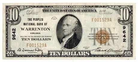Fr.1801-1 1928 $10 National Bank Note Peoples National Bank of WarrentonEstimate: $995