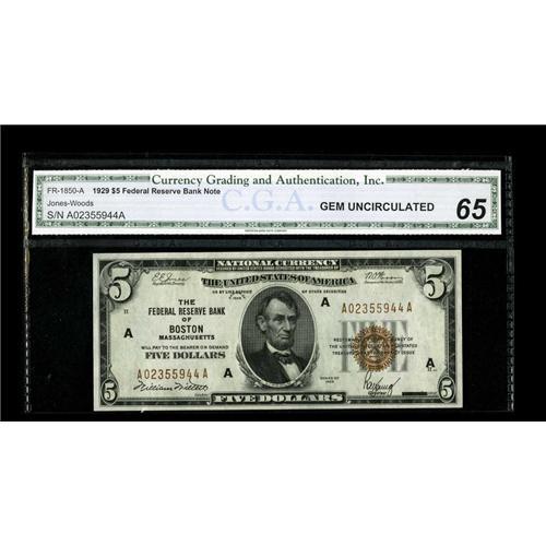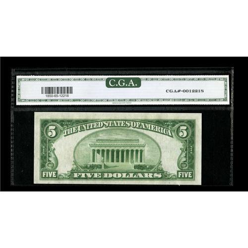 <B>Fr. 1850-A $5 1929 Federal Reserve Bank Note. CGA Gem Uncirculated 65.</B></I><BR>This is a pleasing piece with plenty of embossing visible.<BR><BR><b>Shipping:</b> Coins & Currency (<a target="_blank" href="http://www.heritageauctions.com/common/shipping.php">view shipping information</a>)