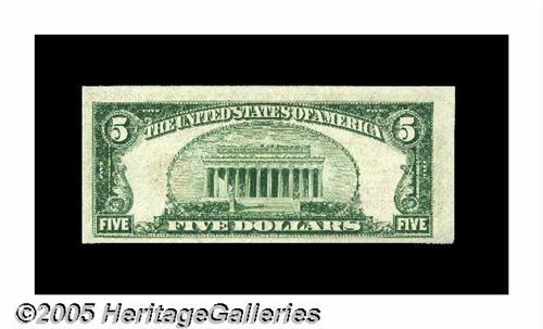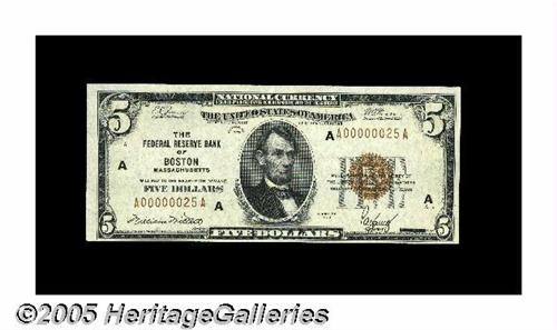 <B>Fr. 1850-A $5 1929 Federal Reserve Bank Note. Choice Crisp Uncirculated.</B></I><BR>Embossing is visible on this $5 with serial number 25 that has toned a shade.