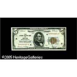 <B>Fr. 1850-A $5 1929 Federal Reserve Bank Note. Choice Crisp Uncirculated.</B></I><BR>Serial number A00000024A, ex-Jim Thompson collection. There is quite a bit of handling present on this note, but it's fully original and well embossed. Lot:15720