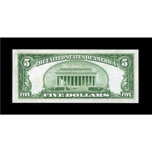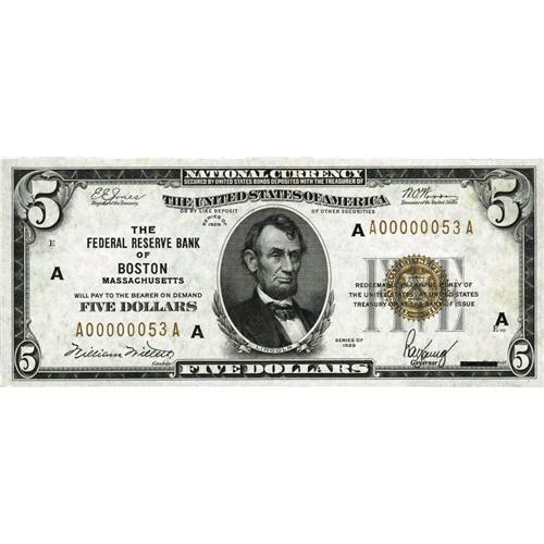 <B>Fr. 1850-A $5 1929 Federal Reserve Bank Note. Superb Gem Crisp Uncirculated.</B></I><BR>Presentation piece quality on this two digit serial Boston note with pristine paper surfaces and boardwalk margins. A candidate for encapsulation as a 66 or 67.