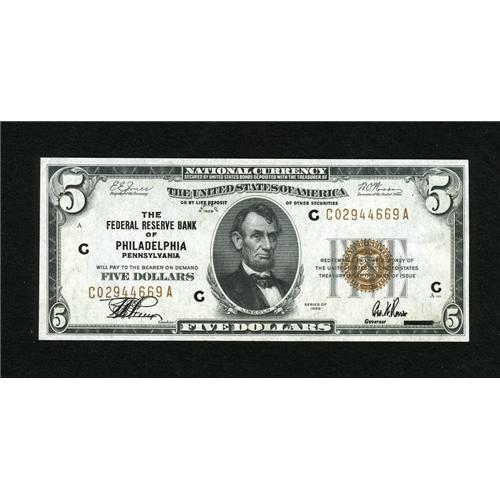 <B>Fr. 1850-C $5 1929 Federal Reserve Bank Note. Crisp Uncirculated.</B></I><BR>This is a lovely Philadelphia FRBN that appears to be a Very Choice CU note but which has a corner tip fold in the upper left corner.<BR><BR><b>Shipping:</b> Coins & Currency (<a target="_blank" href="http://www.heritageauctions.com/common/shipping.php">view shipping information</a>)