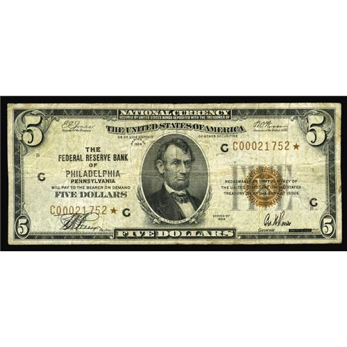 <B>Fr. 1850-C* $5 1929 Federal Reserve Bank Note. Fine.</B></I><BR>A second example of this extremely scarce star in a presentable circulated grade.