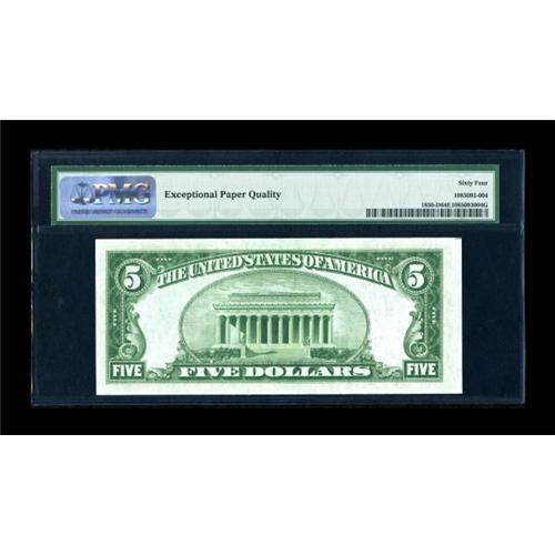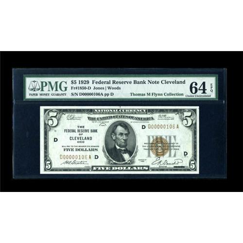 <B>Fr. 1850-D $5 1929 Federal Reserve Bank Note. PMG Choice Uncirculated 64 EPQ.</B></I><BR> A bit off center, particularly on the back, but fresh and well deserving of the PMG Choice 64 EPQ grade. Low serial number D00000106A.<BR><I>From The Thomas M. Flynn Collection</B></I><BR><BR><b>Shipping:</b> Coins & Currency (<a target="_blank" href="http://www.heritageauctions.com/common/shipping.php">view shipping information</a>)