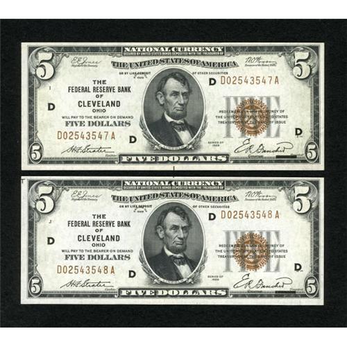 <B>Fr. 1850-D $5 1929 Federal Reserve Bank Notes. Two Examples. Choice Crisp Uncirculated.</B></I><BR> A pair of pleasing, original Cleveland brown seals.<BR><BR><b>Shipping:</b> Coins & Currency (<a target="_blank" href="http://www.heritageauctions.com/common/shipping.php">view shipping information</a>)