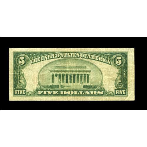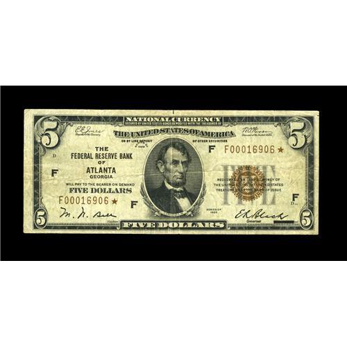 <B>Fr. 1850-F* $5 1929 Federal Reserve Bank Note. Very Fine.</B></I><BR>This is a nice evenly circulated star from a district with just 24,000 notes printed and 18 documented in the census as surviving. <B>Fine-Very Fine.</B></I>